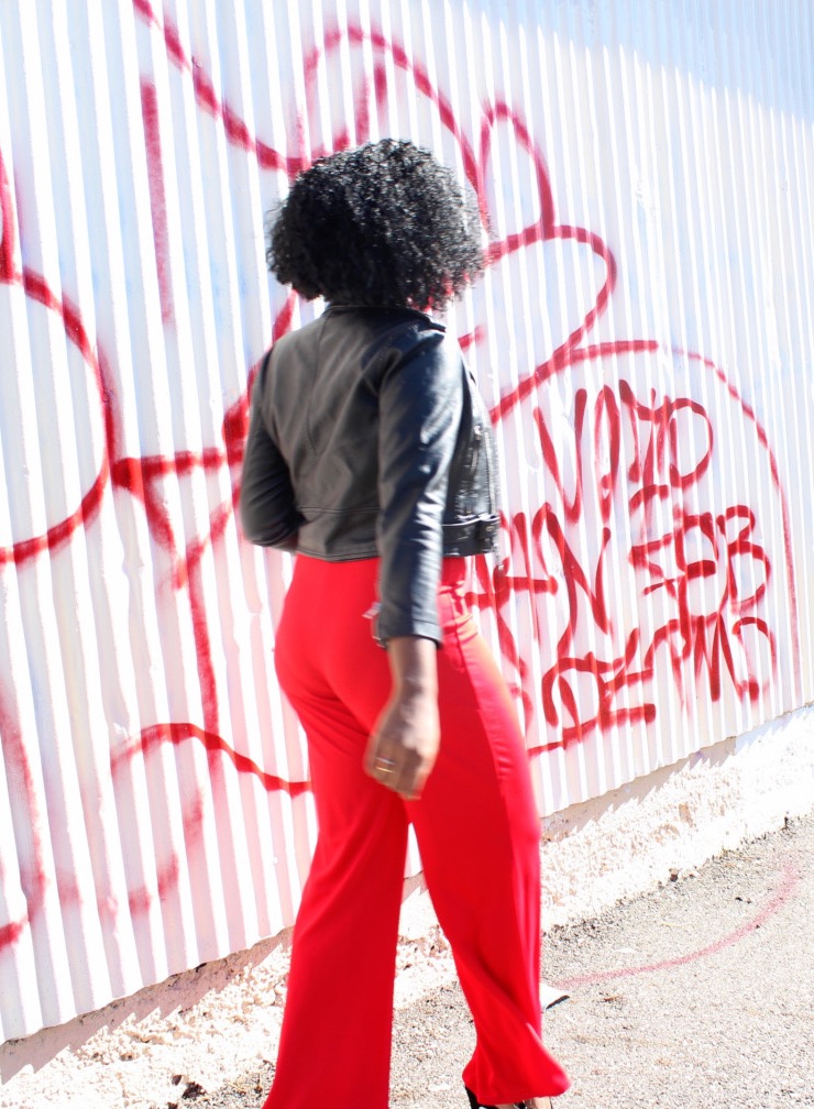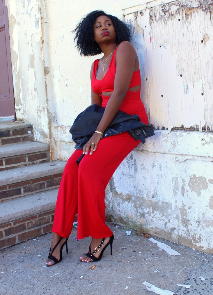 The jumpsuit is definitely a statement piece and I decided to take it up a notch by adding a red lip and pairing the outfit with a cropped leather jacket.
