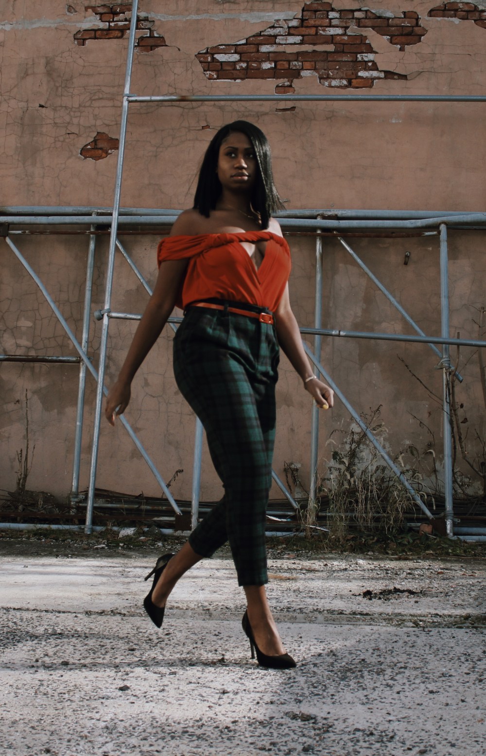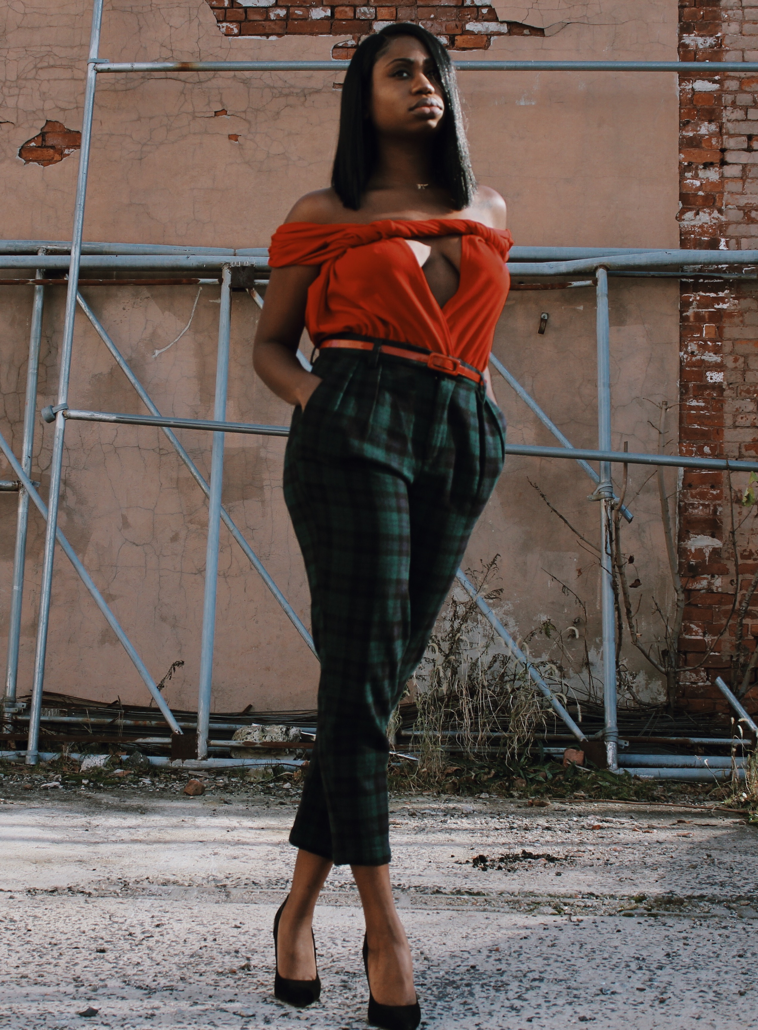 I decided to pair the top with a pair of green plaid trousers and black pumps.