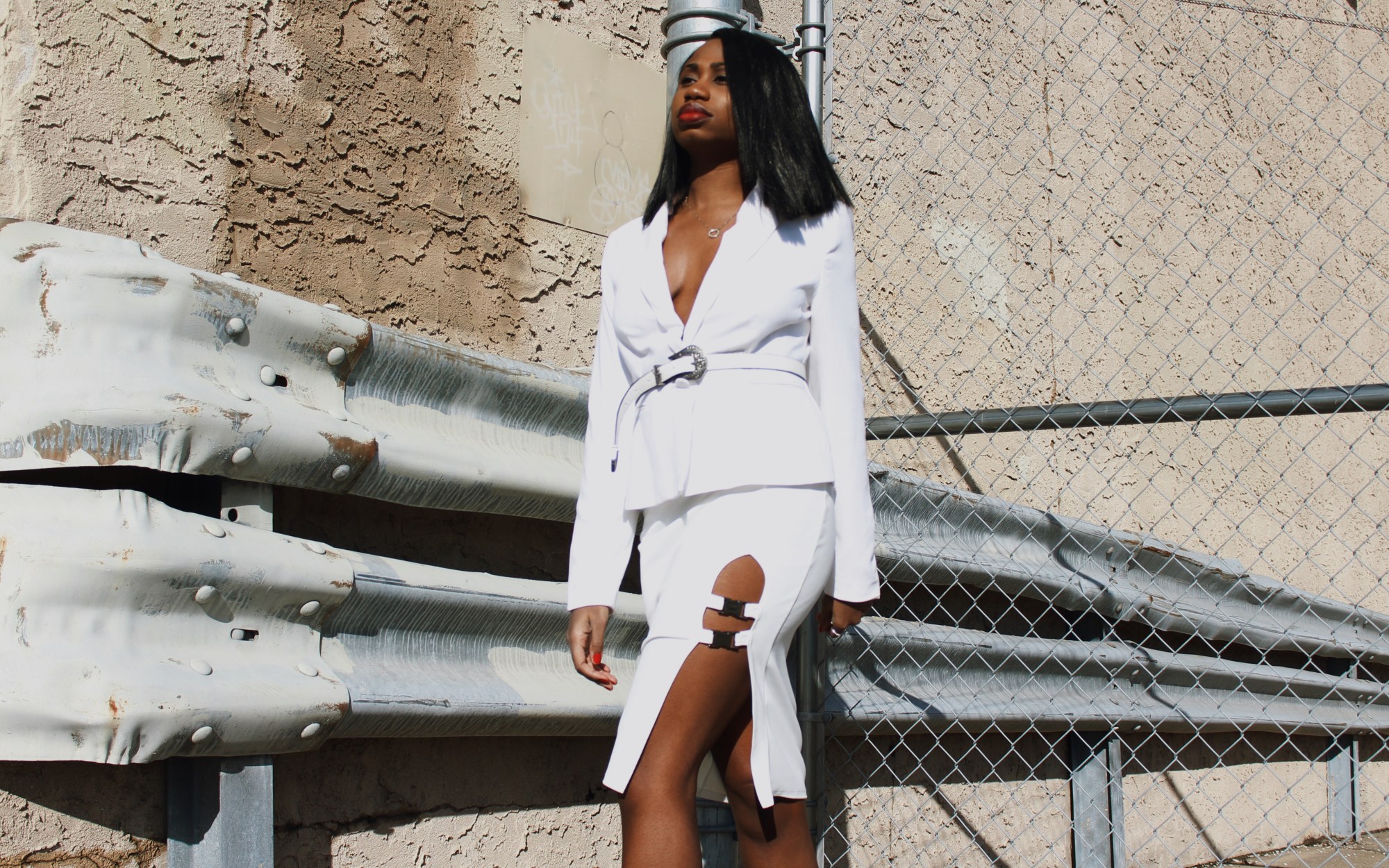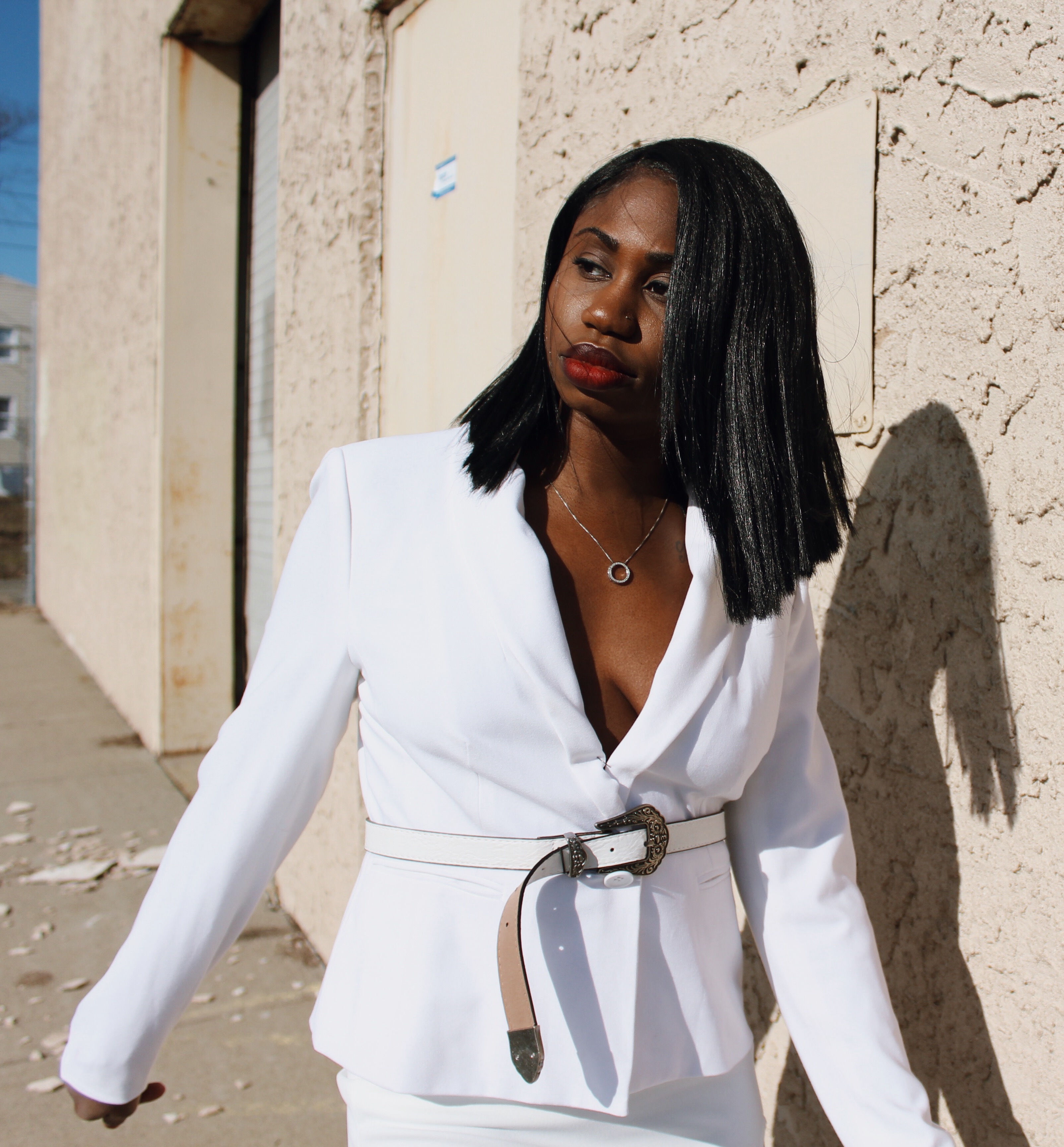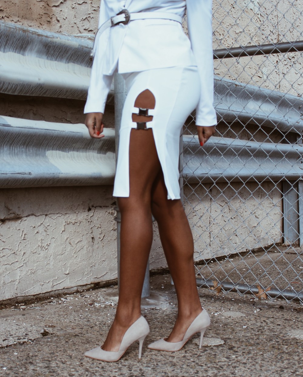 I chose to wear a white blazer with cut-out detailing in the back (I love back details) and no blouse underneath. I paired the blazer with a white high-slit skirt with buckle detailing on the front. I kept it simple with a pair of grayish beige-ish colored pointy-toed pumps.