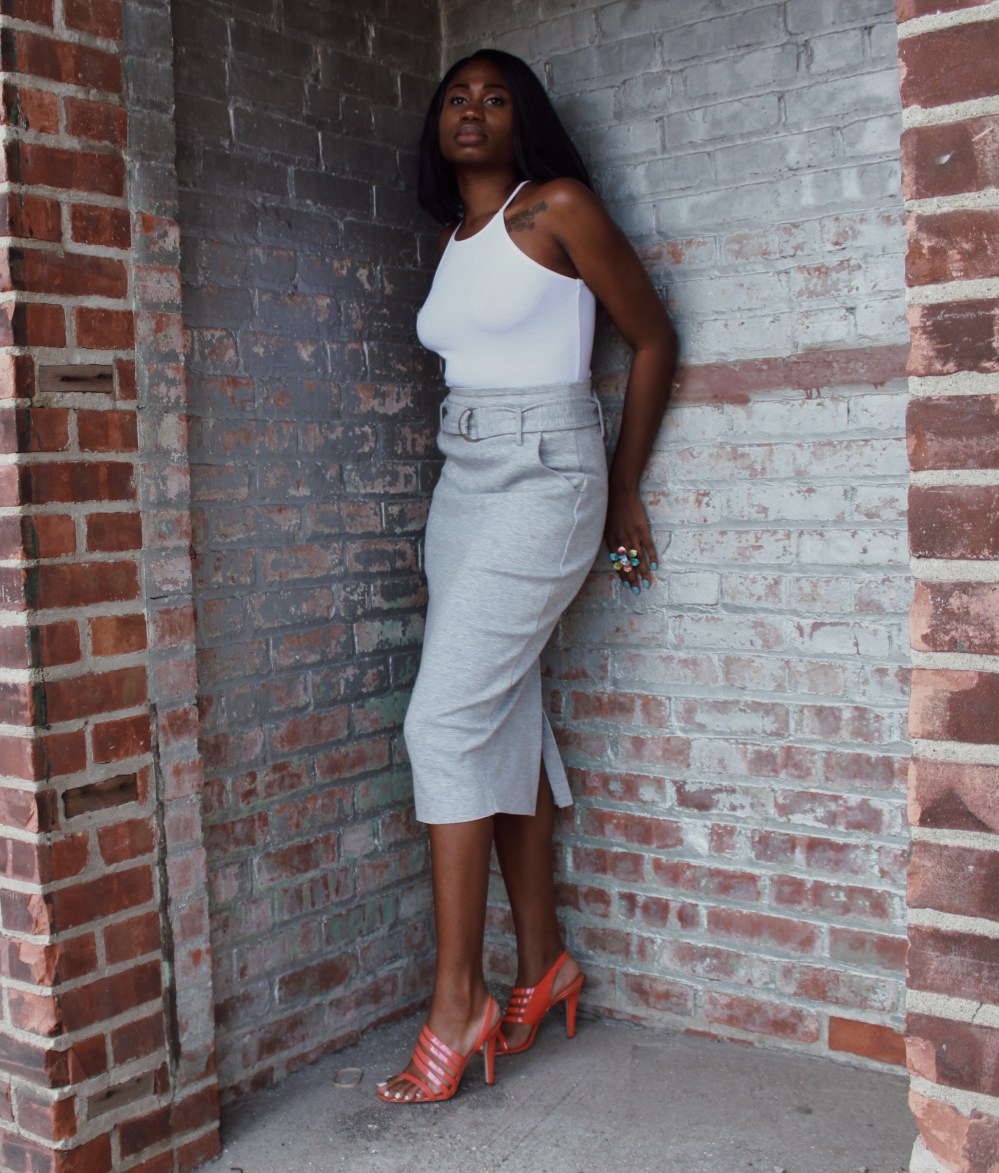 I wore a simple gray midi skirt with the matching belt and a pair of coral colored sling-backs for a pop of color.