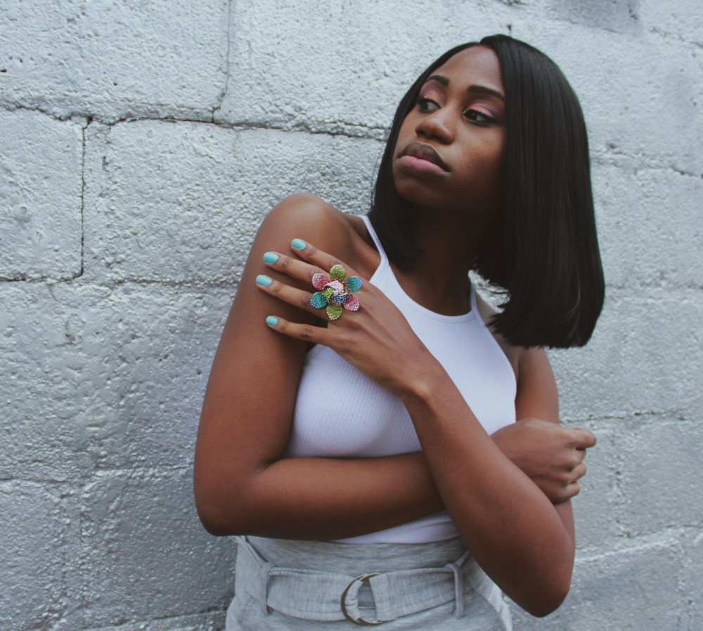 I also wore a brightly colored oversized flower ring and painted my nails blue for some added flare.