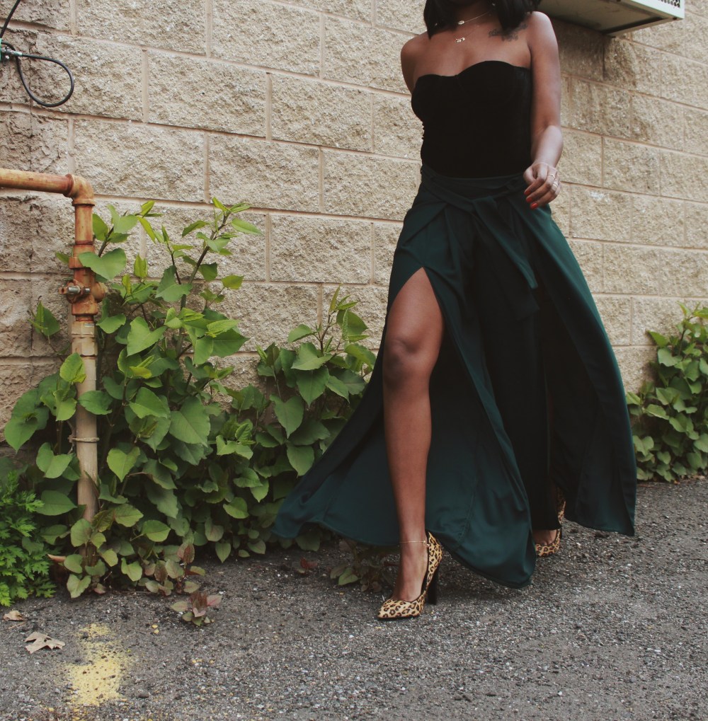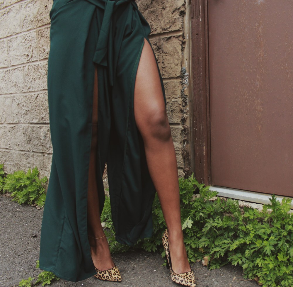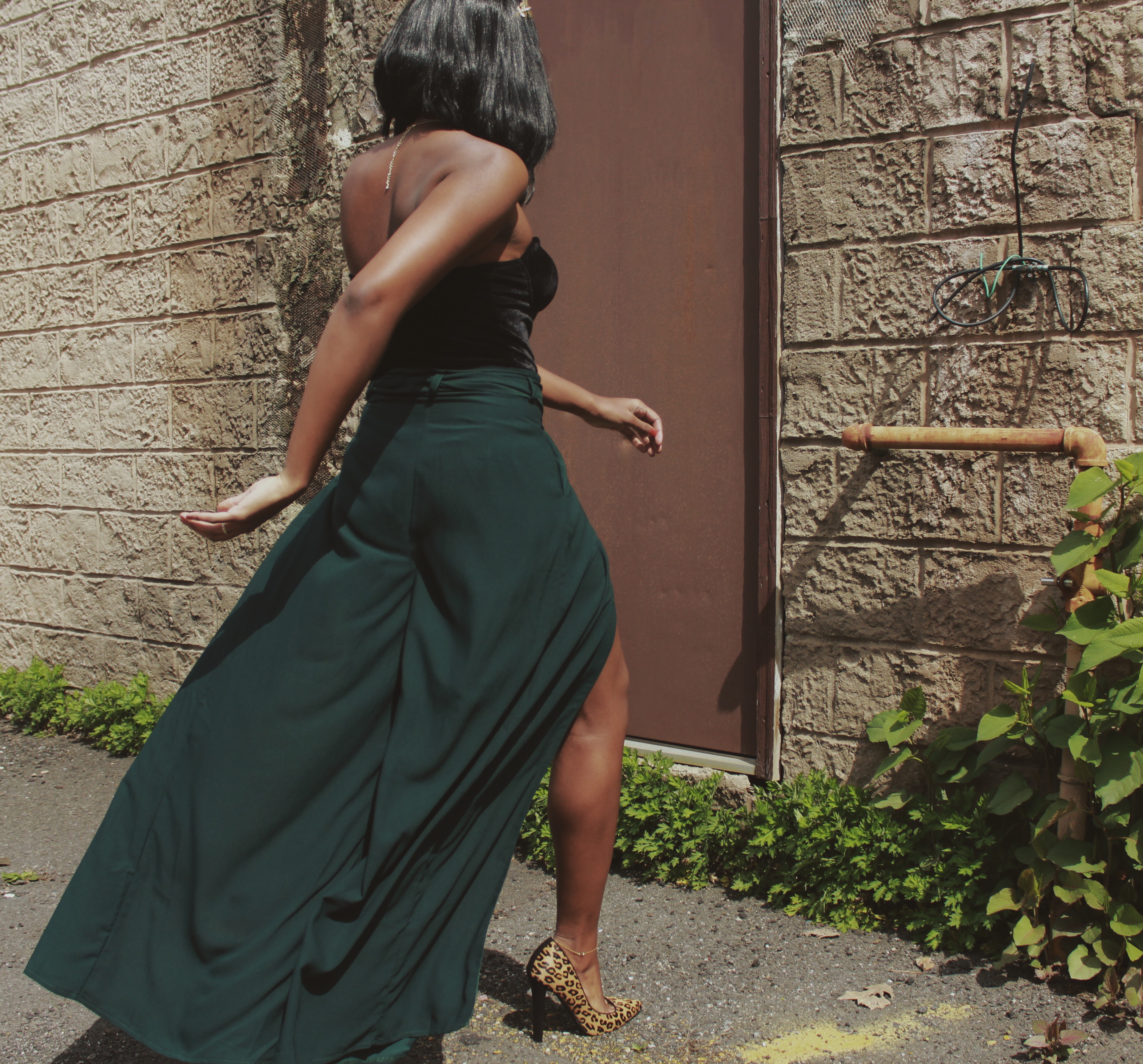 I just KNEW I was gonna wear a pair of leopard print heels with these front-split trousers. I thought the hunter green colored pants would really compliment the pattern of the shoes.