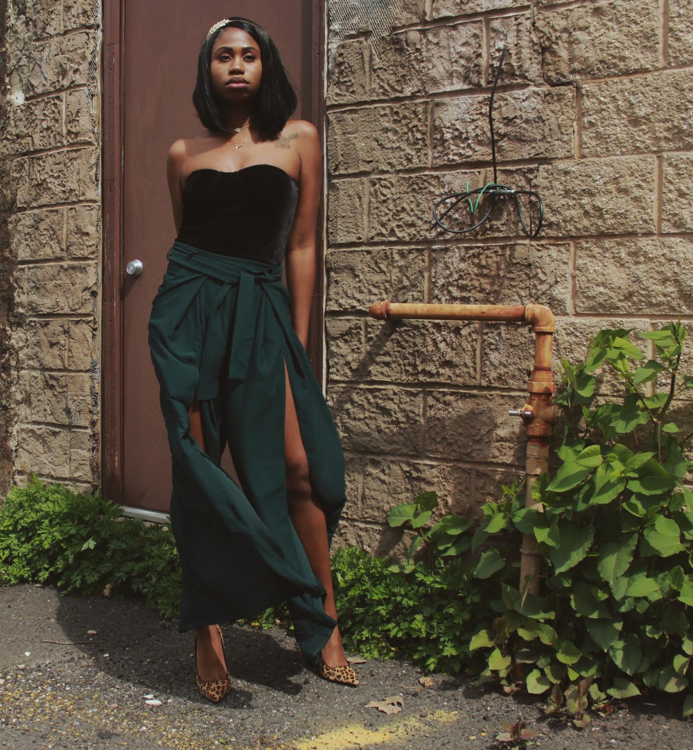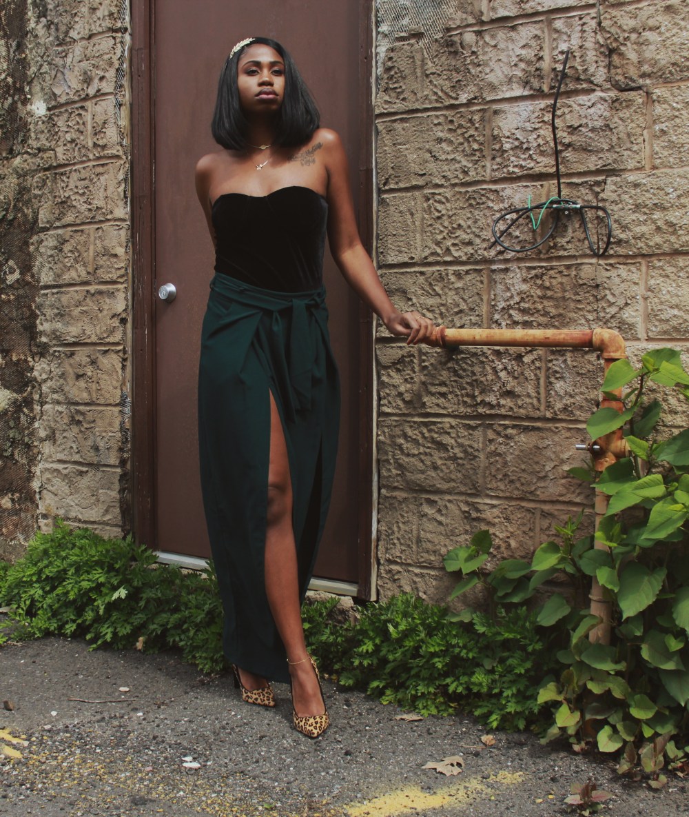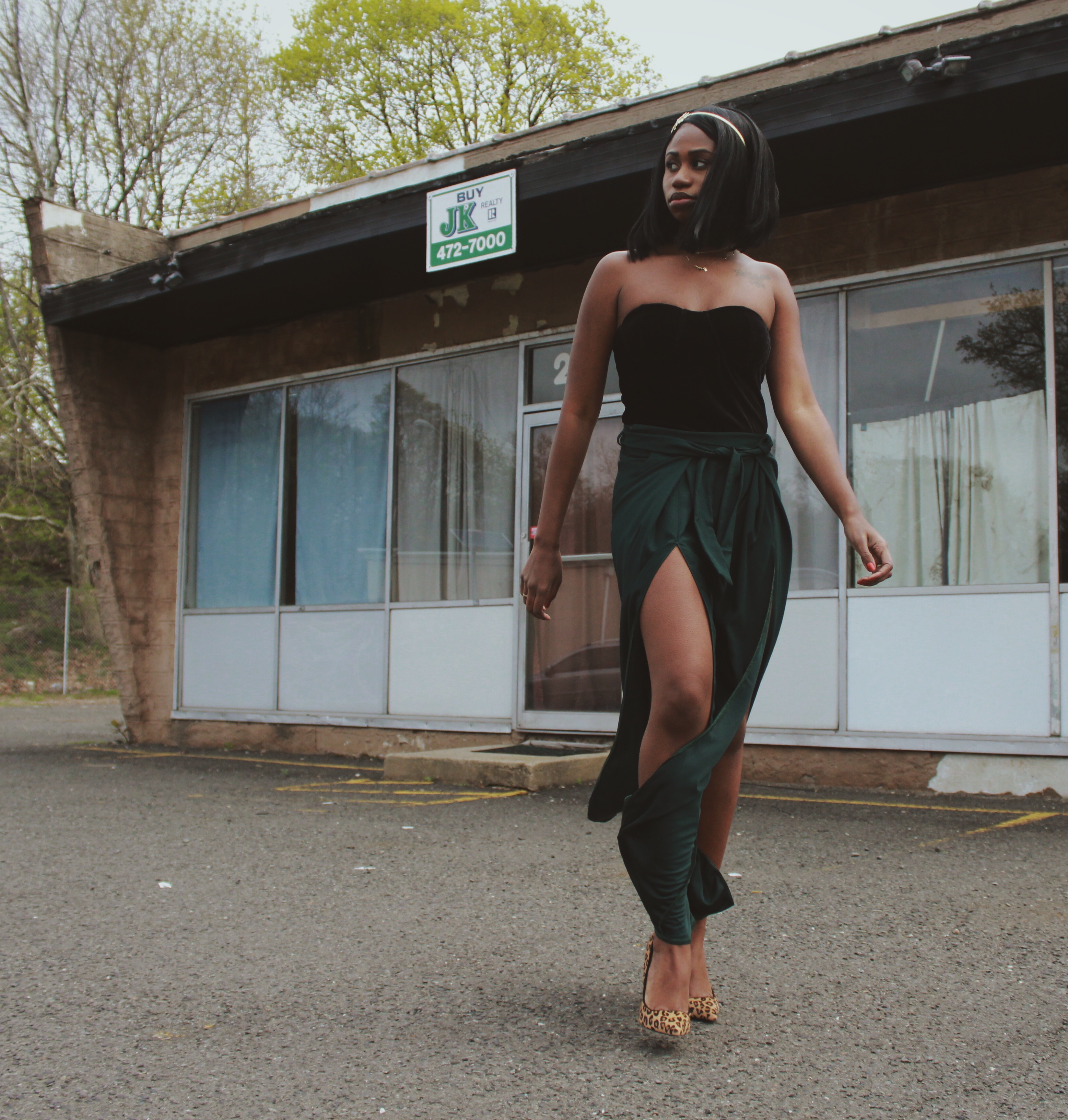 I just KNEW I was gonna wear a pair of leopard print heels with these front-split trousers. I thought the hunter green colored pants would really compliment the pattern of the shoes.