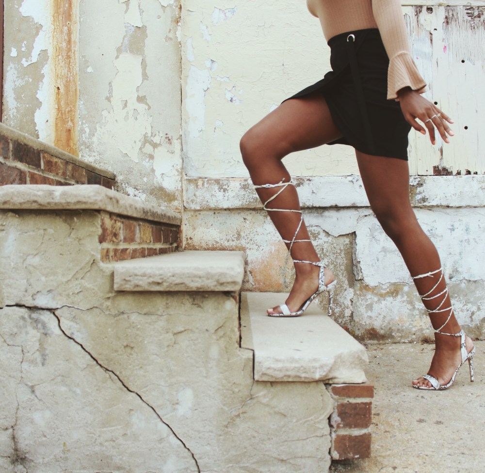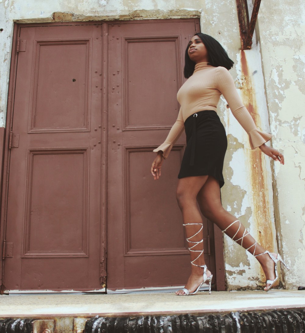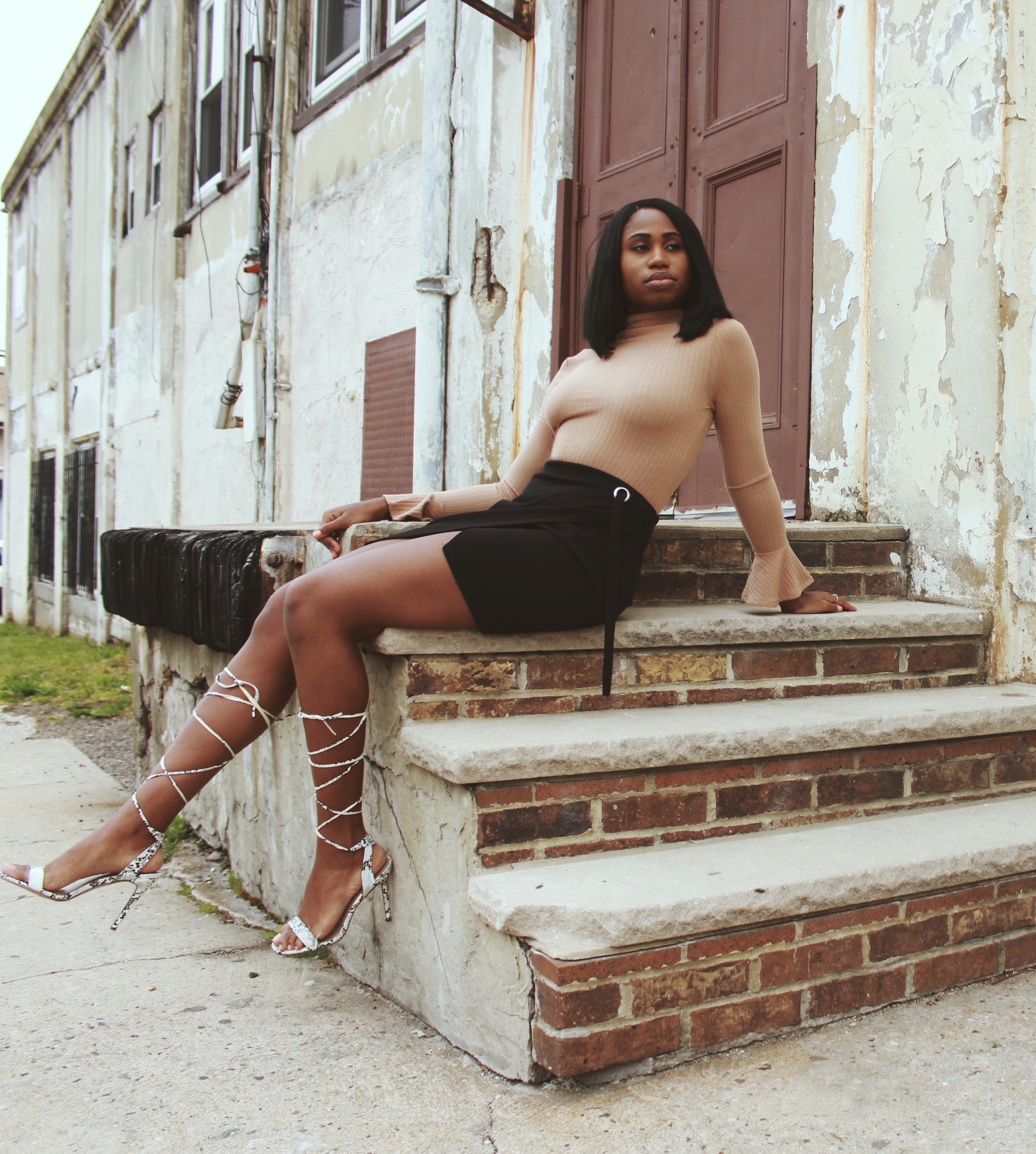 I bought this flared-sleeved ribbed bodysuit for $10 a while ago and I paired the top with a black mini skirt. The snakeskin lace-up heels tied the whole outfit together (pun intended. lol I’m so corny).