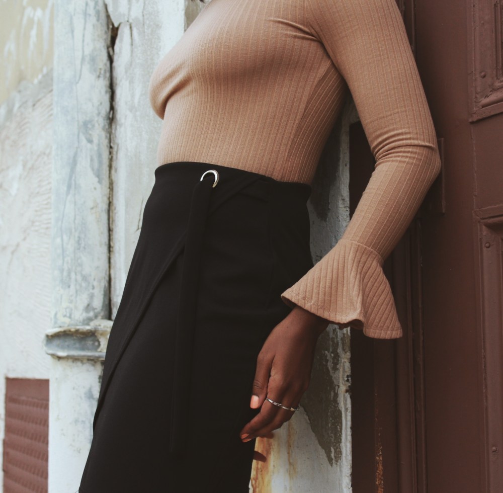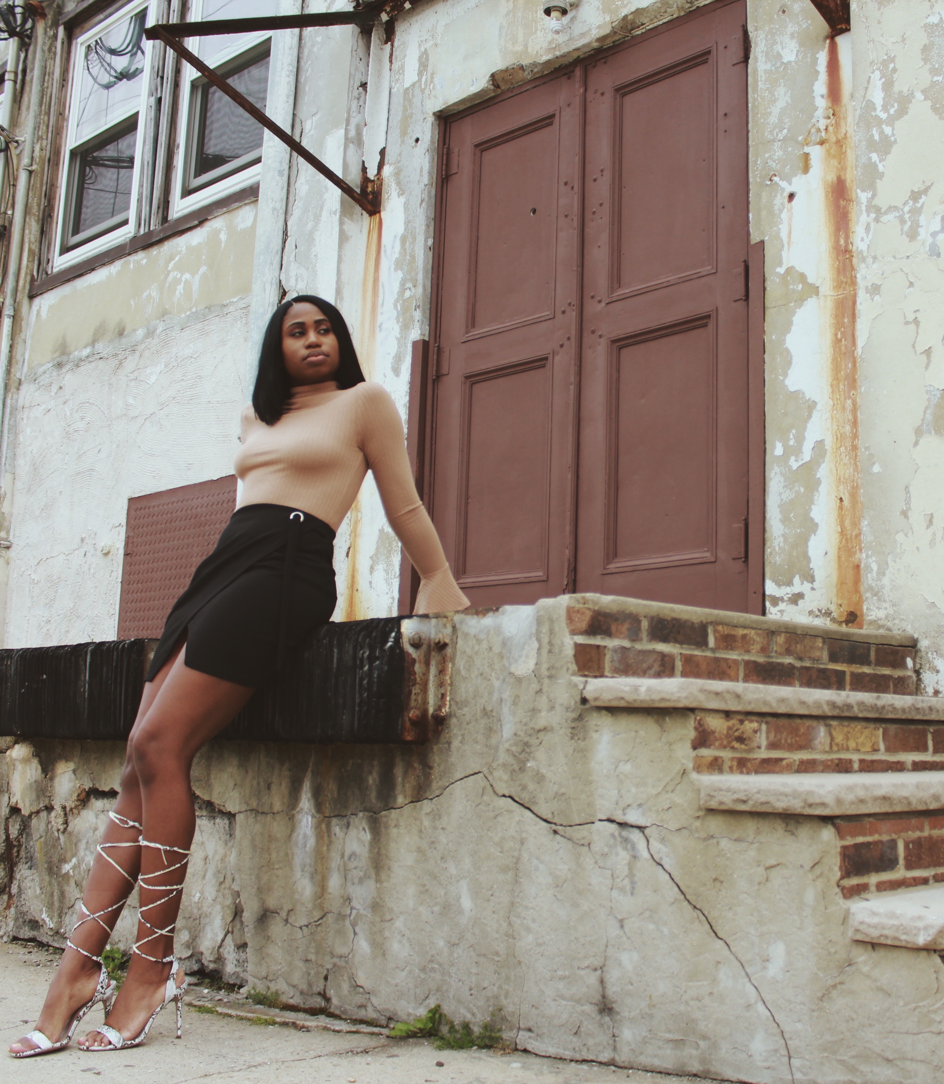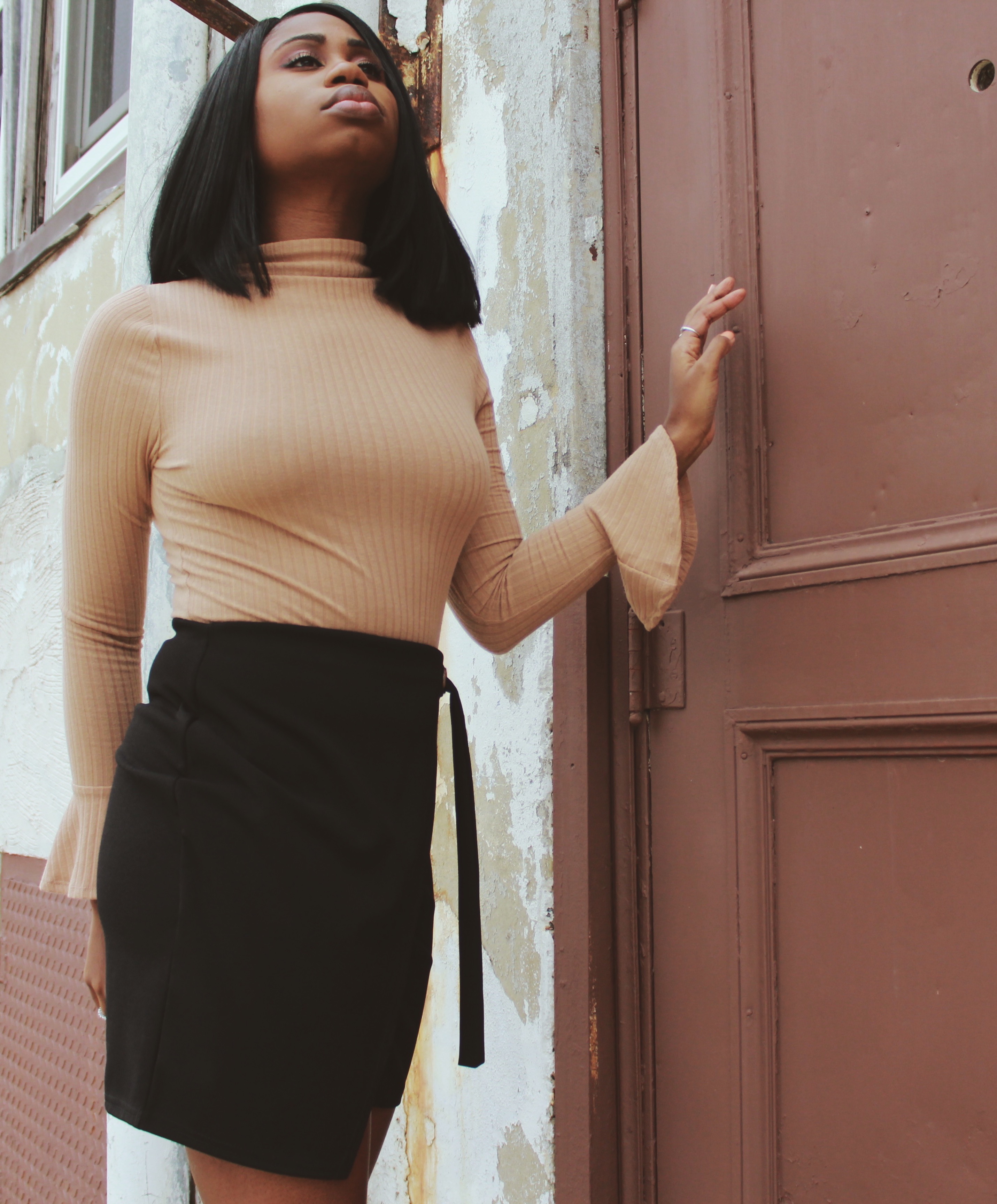 I bought this flared-sleeved ribbed bodysuit for $10 a while ago and I paired the top with a black mini skirt. The snakeskin lace-up heels tied the whole outfit together (pun intended. lol I’m so corny).