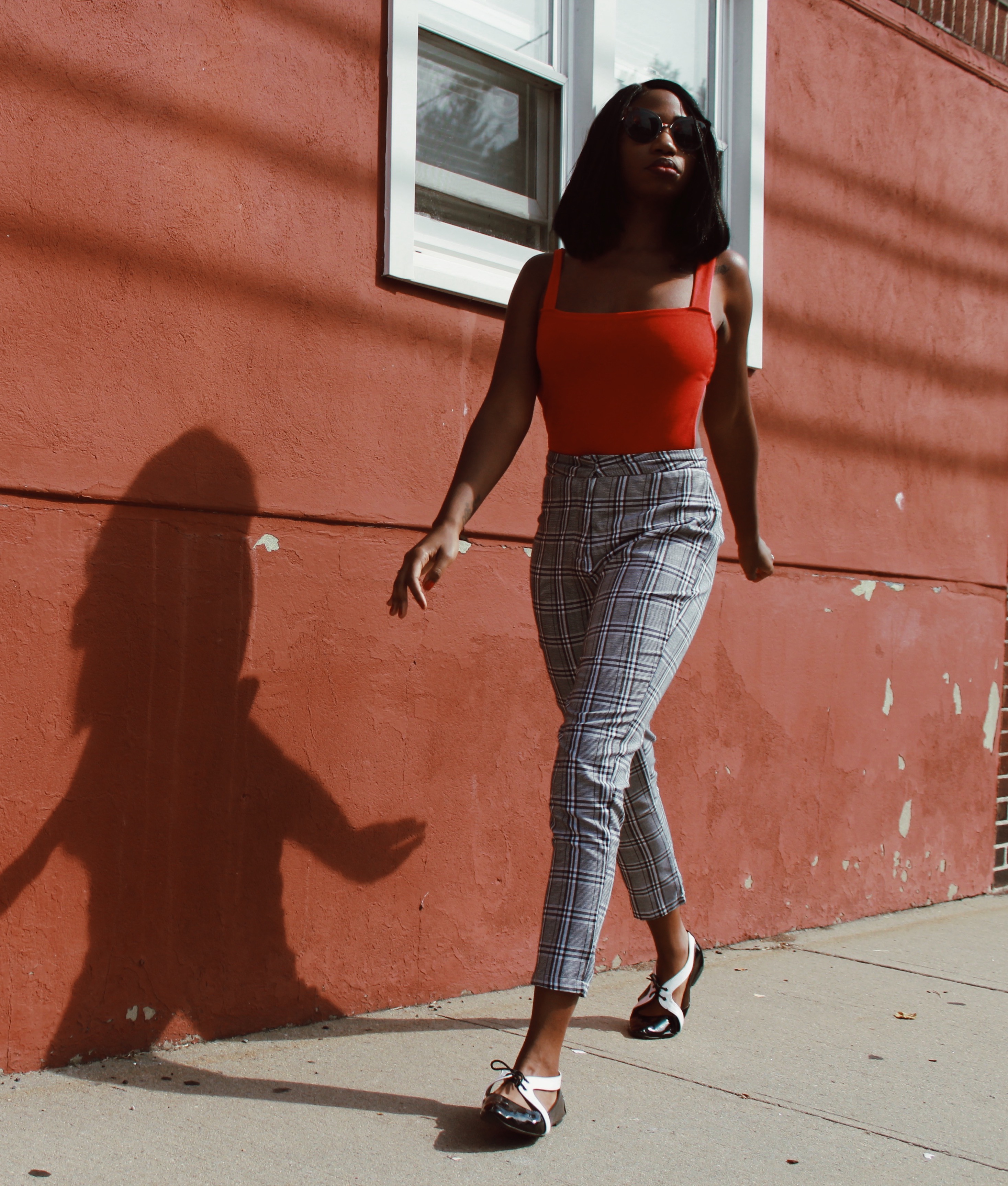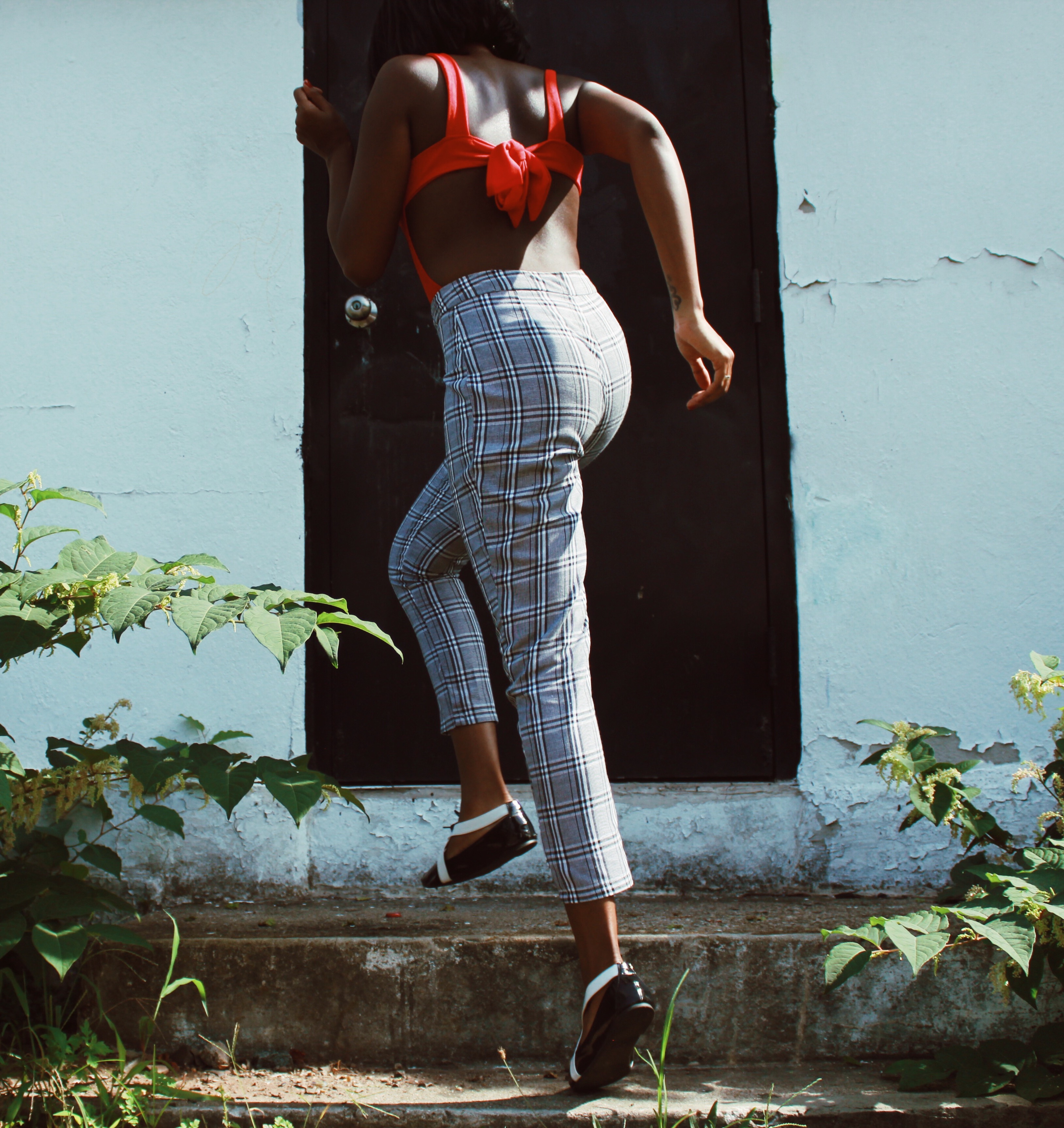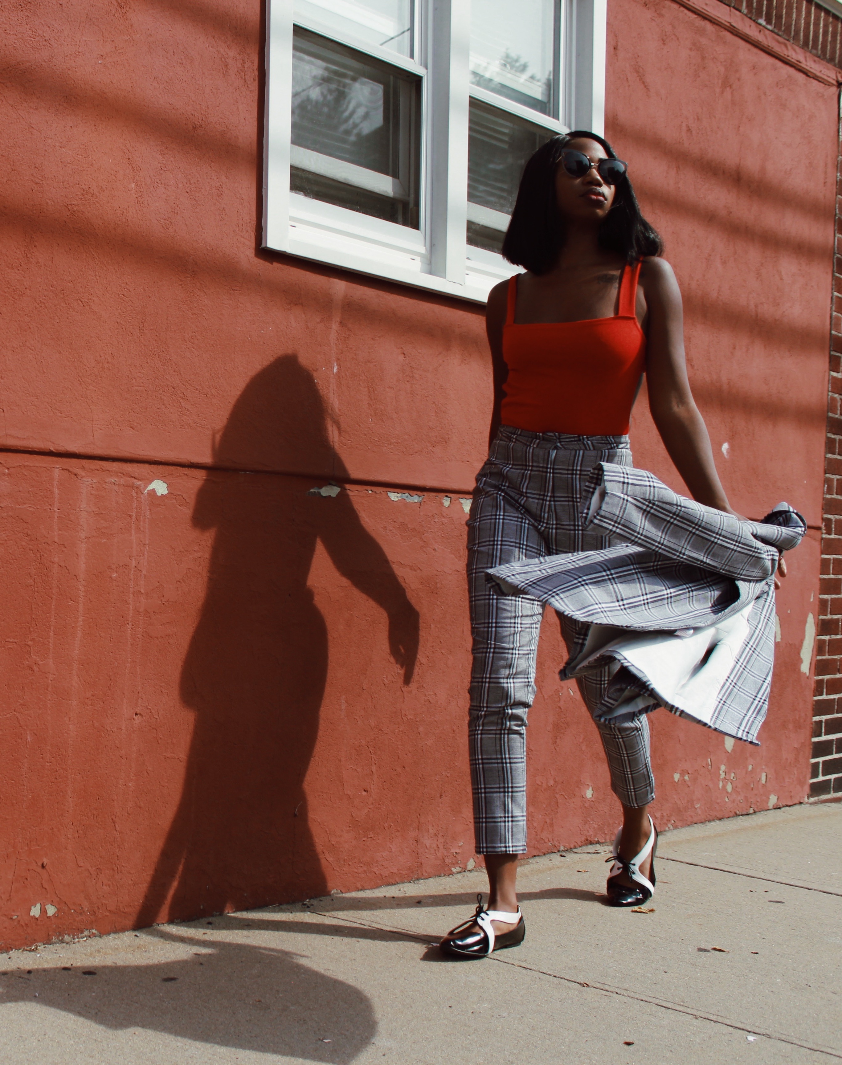 Instead, I paired the checkered trousers with a red backless bodysuit and my little tuxedo flats.