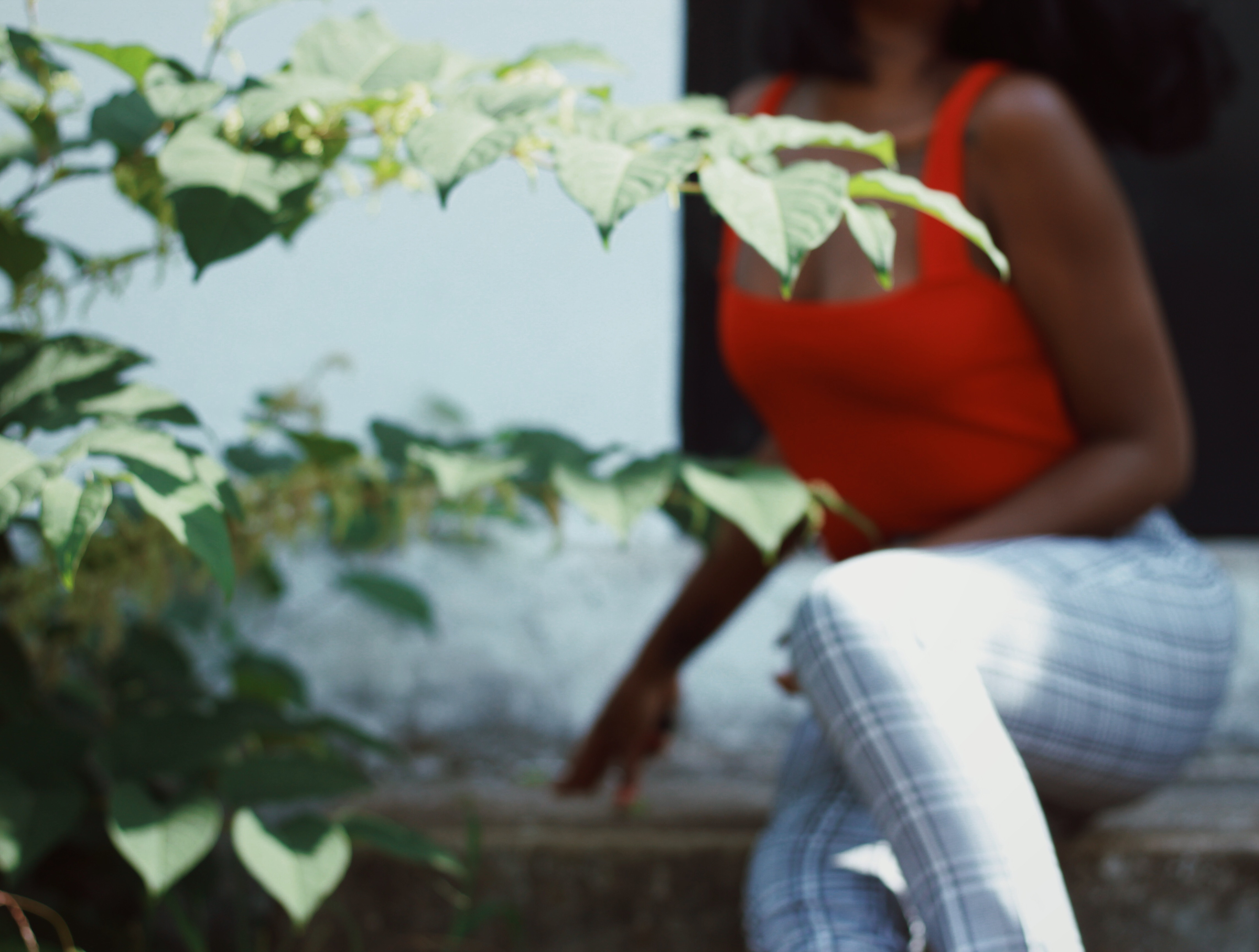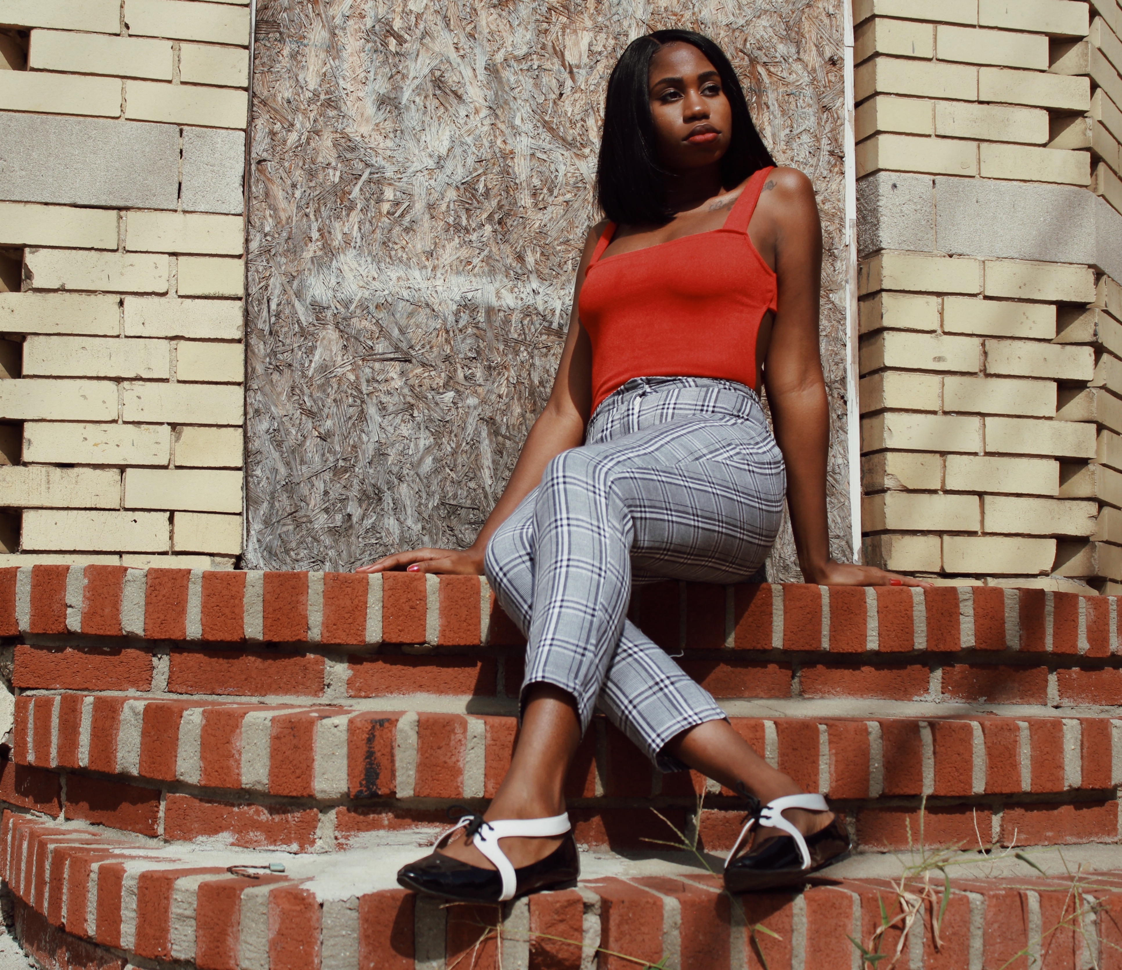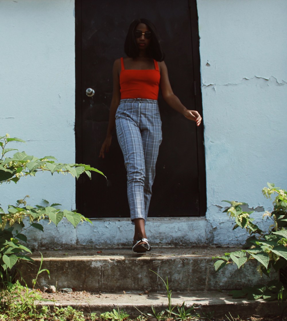 Instead, I paired the checkered trousers with a red backless bodysuit and my little tuxedo flats.