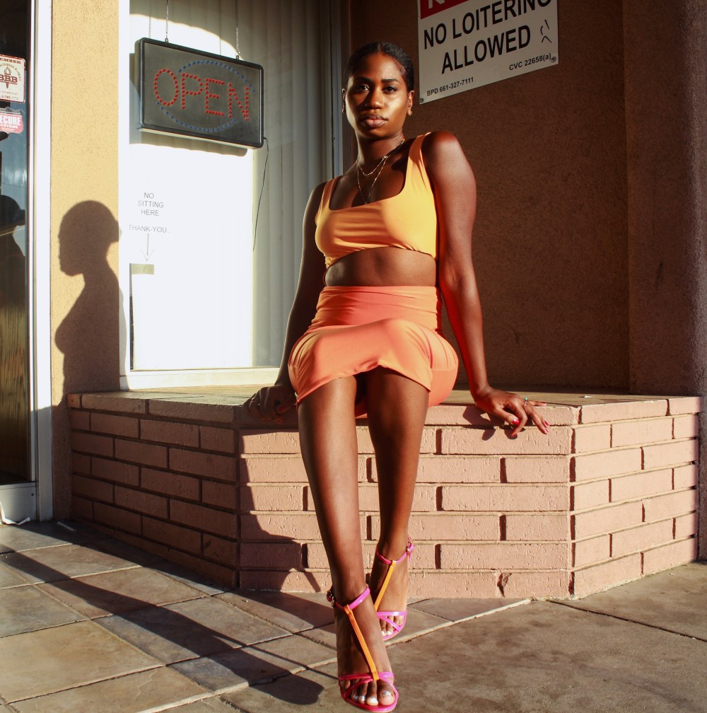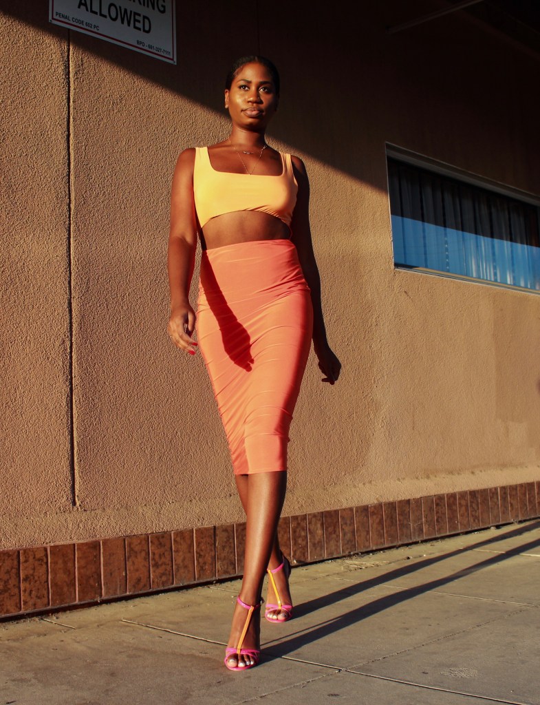 This midi dress features a cut-out in the mid-section which to me, adds an unexpected sexiness to the dress. The silhouette also gives the illusion that I have some curves too.